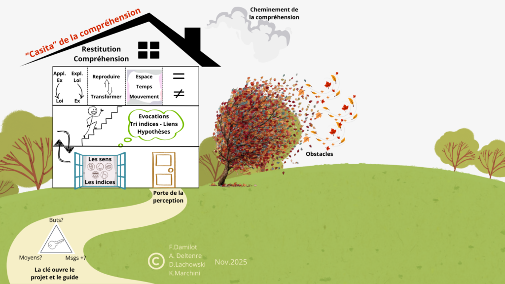 • dans le grenier, une restitution pourra avoir lieu et le feedback de l’enseignant.e guidera l’élève dans la maison si la compréhension doit encore être approfondie – les obstacles, une fois identifiés, permettent à l’apprenant de continuer à cheminer dans sa quête de sens.